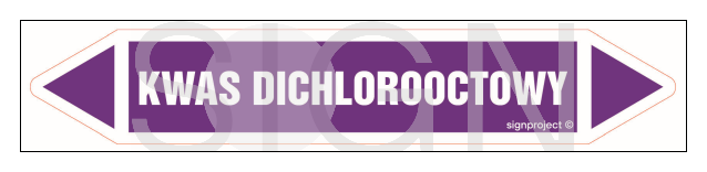 Znak „KWAS DICHLOROOCTOWY” przeznaczony jest do oznaczenia instalacji rurociągowej, w której przepływa konkretna substancja – KWAS DICHLOROOCTOWY lub produkt ją zawierający. KWAS DICHLOROOCTOWY jest organicznym związkiem chemicznym, który znalazł swoje zastosowanie w chemii organicznej jako rozpuszczalnik. Znak ma podłużny kształt, jest w kolorze fioletowym z białym napisem. Znajdują się też na nim strzałki, które wskazują kierunek przepływu zawartości rurociągu. Znak „KWAS DICHLOROOCTOWY” dostępny jest w czterech formatach: 14 x 2,5 cm, 22,5 x 4 cm, 33,8 x 6 cm i 56,3 x 10 cm. Wykonany został na folii samoprzylepnej, która idealnie dopasowuje się do powierzchni, również zaokrąglonych i nierównych. Zapewnia trwałość i dobre przyleganie do podłoża nawet w nieco trudniejszych warunkach.Ilość naklejek na arkuszu