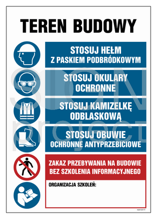 OI003 Teren budowy, Stosuj hełm z paskiem podbródkowym, Stosuj okulary ochronne, Stosuj kamizelkę odblasko