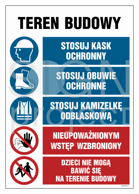 OI006 Teren budowy, Stosuj kask ochronny, Stosuj obuwie ochronne, Stosuj kamizelkę odblaskową, Nieupoważni