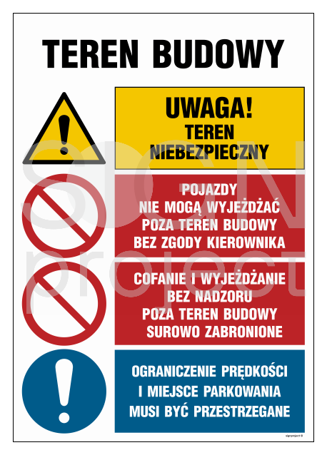 OI014 Teren budowy, Uwaga! teren niebezpieczny, Pojazdy nie mogą wyjeżdżać poza teren budowy bez zgody kie