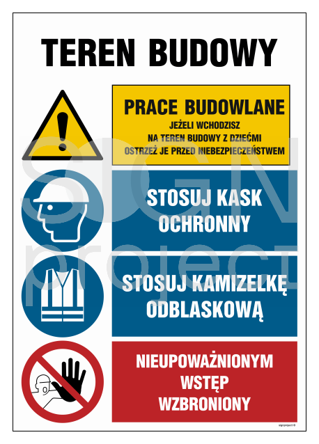 OI015 Teren budowy, Uwaga! teren niebezpieczny, Pojazdy nie mogą wyjeżdżać poza teren budowy bez zgody kie