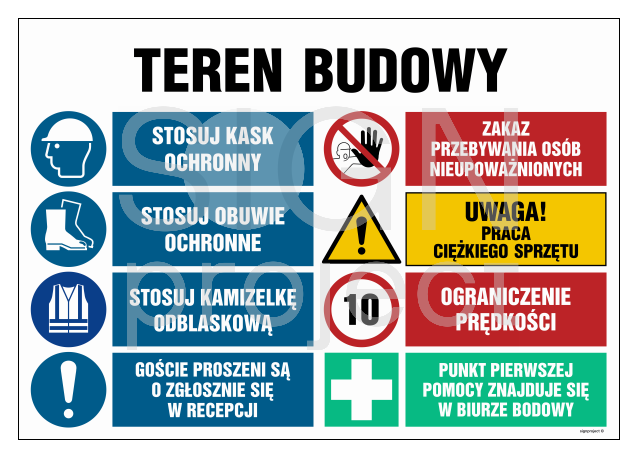 OI023 Teren budowy, Stosuj kask ochronny, Zakaz przebywania osób nieupoważnionych, Stosuj obuwie ochronne,