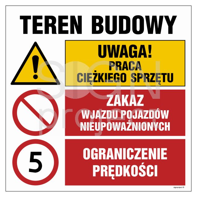 OI032 Uwaga! praca ciężkiego sprzętu, Zakaz wjazdu pojazdów nieupoważnionych, Ograniczenie prędkości do 5k
