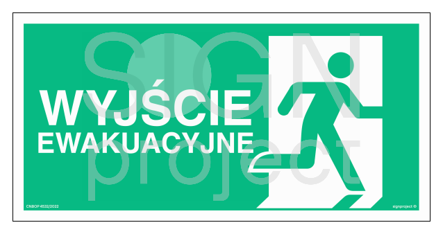 Znak „Kierunek drogi ewakuacyjnej” Znak „Kierunek drogi ewakuacyjnej” przeznaczony jest do oznaczenia drogi ewakuacyjnej w budynkach użytku publicznego. Jest on w kolorze zielonym z obramowaniem i piktogramem strzałki. Ma kształt kwadratu. Znak „Kierunek drogi ewakuacyjnej” jest łatwy w interpretacji i jednoznacznie wskazuje, w którym kierunku prowadzi droga ewakuacji w budynku. Znak „Kierunek drogi ewakuacyjnej” wykonujemy na następujących podłożach:• folia samoprzylepna fotoluminescencyjna• płyta TD fotoluminescencyjna• płyta sztywna 1mm fotoluminescencyjnaPiktogram strzałki jest widoczny w ciemności, ponieważ powstał z wykorzystaniem technologii fotoluminescencyjnej. Znak „Kierunek drogi ewakuacyjnej” dostępny jest w rozmiarach: 30 x 10 cm, 30 x 15 cm, 45 x 15 cm, 60 x 20 cm i 90 x 30 cm.