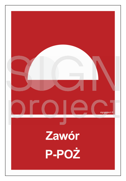 Znak „Zawór P-POŻ” należy do oznakowania przeciwpożarowego i przeznaczony jest do oznaczenia lokalizacji zaworu hydrantowego. Jest to jeden z elementów, które wchodzą w skład hydrantu wewnętrznego. Umożliwia on podłączenia węża pożarniczego w celu ugaszenia ognia. Znak „Zawór P-POŻ” składa się z dwóch elementów – półokrągłego piktogramu i napisu „Zawór P-POŻ”, które znajdują się na czerwonym tle. Znak dostępny jest w wielu formatach do wyboru: 5 x 7,4 cm, 10 x 14,8 cm, 15 x 22,2 cm, 20 x 29,6 cm, 25 x 37 cm, 35 x 51,8 cm, 40 x 59,4 cm i 50 x 74 cm. Wykonujemy go również na kilku podłożach. Są to:• Folia podłogowa (w opcji fotoluminescencyjnej)• Płyta sztywna 1 mm (w opcji fotoluminescencyjnej)• Folia samoprzylepna (w opcji fotoluminescencyjnej)• Płyta TD fotoluminescencyjnaPodłoże