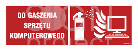 Znak „Gaśnica do gaszenia sprzętu komputerowego” jednoznacznie wskazuje na lokalizację sprzętu gaśniczego przeznaczonego do bezpiecznego gaszenia elektronicznego sprzętu komputerowego. Znak PPOŻ ma za zadanie usprawnić akcję ratowniczą i przyśpieszyć usunięcie ognia, zapobiegając szybkiemu rozprzestrzenianiu się pożaru. Znak „Gaśnica do gaszenia sprzętu komputerowego” należy umieścić w widocznym miejscu, bezpośrednio przy sprzęcie gaśniczym. Znak „Gaśnica do gaszenia sprzętu komputerowego” jest w orientacji poziomej. Składa się z dwóch elementów – napisu „Do gaszenia sprzętu komputerowego” i piktogramu komputera z ogniem i gaśnicą. Jest w kolorze czerwono-białym. Dostępny jest w dwóch rozmiarach: 36 x 14 cm i 54 x 21 cm. Do wyboru jest kilka wariantów w zależności od podkładu, na jakim znak został wykonany: • Folia samoprzylepna• Folia samoprzylepna fotoluminescencyjna• Płyta sztywna 1 mm • Płyta sztywna 1 mm fotoluminescencyjna • Płyta TD fotoluminescencyjna• Folia podłogowa • Folia podłogowa fotoluminescencyjnaPodłoże