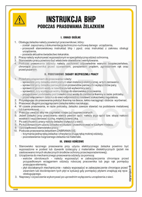 Tablica „Instrukcja BHP podczas prasowania żelazkiem” to zestaw konkretnych wytycznych, jak postępować podczas użytkowania żelazka, aby cały proces był bezpieczny i z możliwie najmniejszym ryzykiem wystąpienia ewentualnych niepożądanych zdarzeń. Instrukcja BHP podczas prasowania żelazkiem zawiera uwagi ogólne, podstawowe zasady bezpiecznej pracy i uwagi końcowe. Wszystkie informacje zostały wyszczególnione w punktach. Instrukcja BHP podczas prasowania żelazkiem jest w formie tablicy o wymiarach 24,5 x 35 cm. Ma białe tło, żółte obramowanie i czarne napisy. Wykonana jest do wyboru na:• Folii samoprzylepnej• Płycie elastycznej 0,4 mm• Płycie sztywnej 1 mmZnak „Instrukcja BHP podczas prasowania żelazkiem” należy umieścić bezpośrednio przy urządzeniu, w miejscu wykonywania czynności prasowania, w widocznym i łatwo dostępnym miejscu. Podłoże