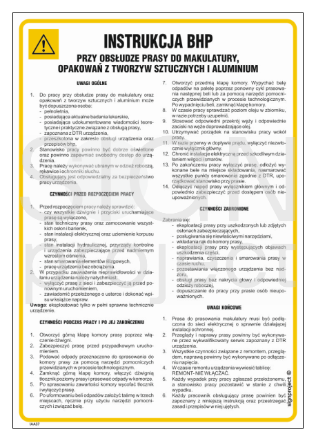 IAA37 Health and safety instructions for the use of a waste paper baler