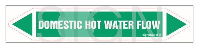 Znak „Domestic hot water flow” to naklejka kierunkowa należąca do oznakowania instalacji rurociągowych. Znajduje się na niej napis „Domestic hot water flow”, który oznacza obecność przepływu ciepłej wody użytkowej. Na znaku widoczne są też strzałki wskazujące na kierunek przepływu cieczy. Znak „Domestic hot water flow” ułatwia prawidłowe rozpoznanie zawartości rurociągów, na co wpływ ma dodatkowo zielony kolor naklejki. Znak „Domestic hot water flow” dostępny jest w następujących formatach: • 14 x 2,5 cm • 22,5 x 4 cm • 33,8 x 6 cm • 56,3 x 10 cm Wykonany został na folii samoprzylepnej, co ułatwia jego aplikację. Nie ma konieczności dodatkowo stosowania kleju czy innych akcesoriów mocujących. Znak „Domestic hot water flow” należy umieścić na rurociągu w widocznym miejscu. Ilość naklejek na arkuszu